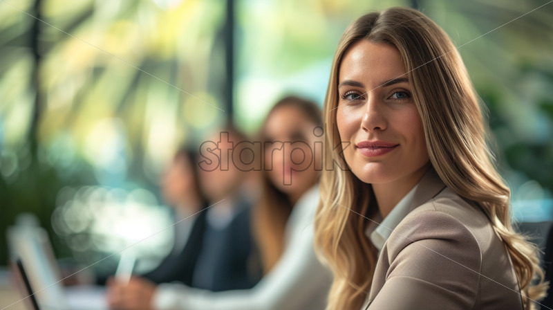Caucasian mature man and woman at meeting table discussing a business plan with laptop computer in office. Workers on background Royalty Free Stock photo