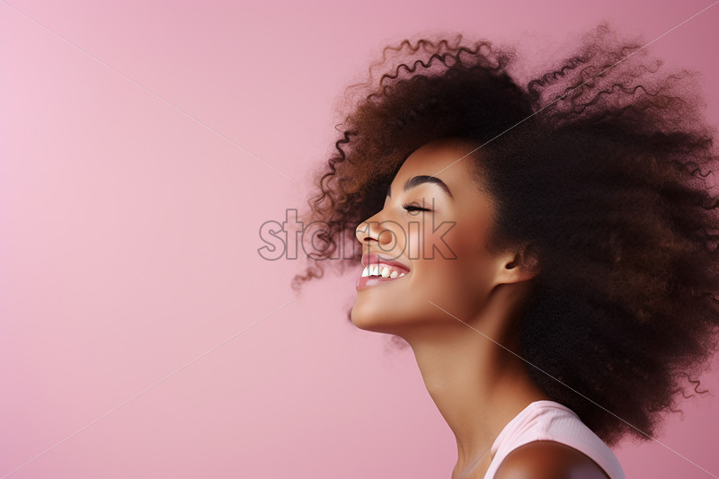 Close-up shot of a young caucasian girl with curly long dark brown hair and bangs. Freckles on the face. Covering breast with cowboy hat. Expressing tenderness. Isolated background