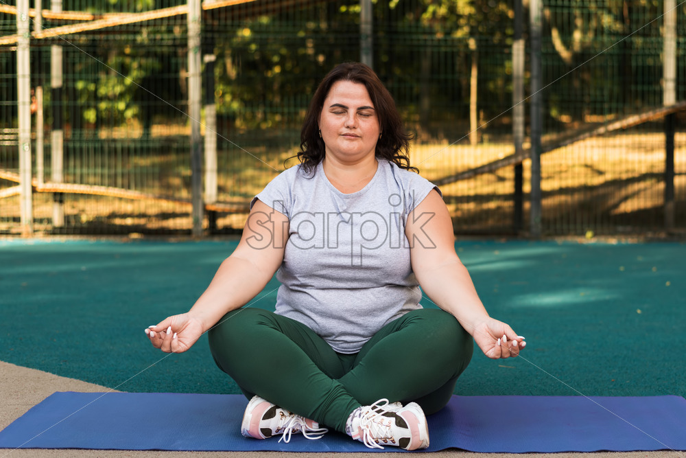 Portrait of a woman with overweight in a tracksuit meditating on a yoga mat on a sports field in a park