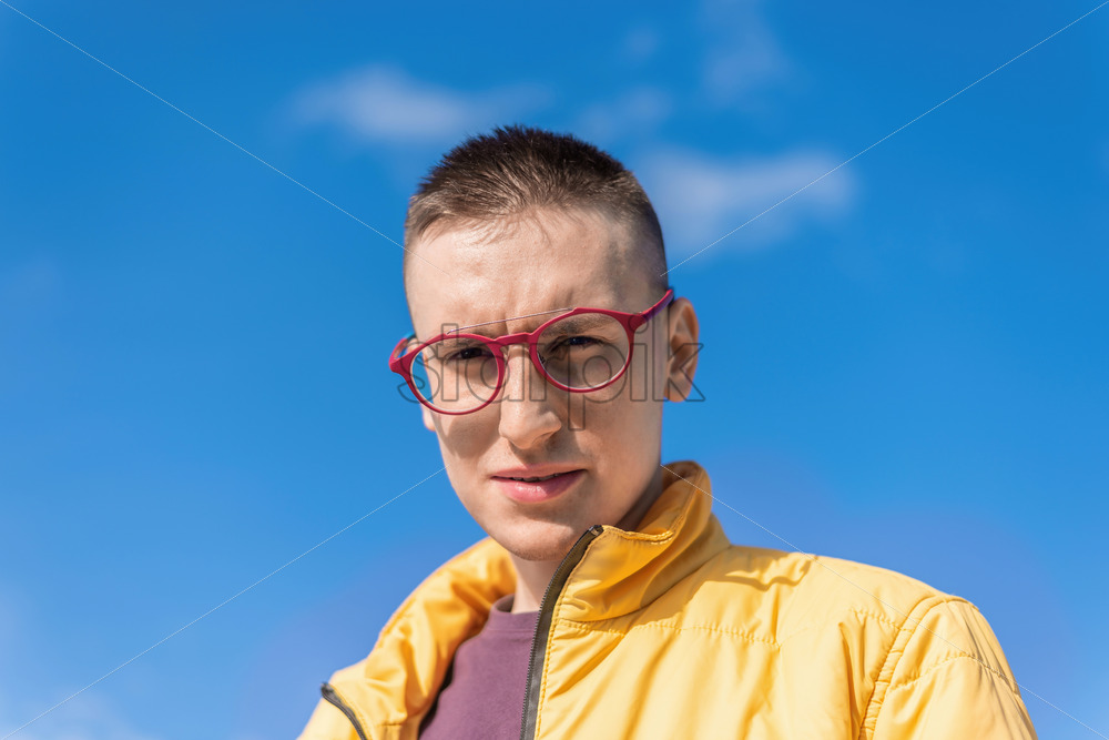 Portrait of a young man in glasses looking into the camera, blue sky on the background