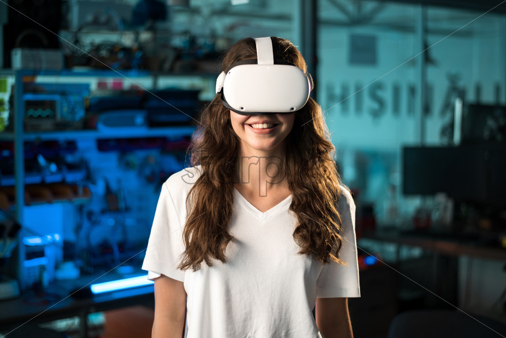 A young woman is excited while putting on VR glasses, controllers. Slow motion virtual reality Download royalty free stock video footage Royalty Free Stock Video Footage