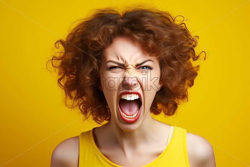 Close-up shot of a young caucasian girl with curly long dark brown hair and bangs. Freckles on the face. Expressing tenderness. Isolated background