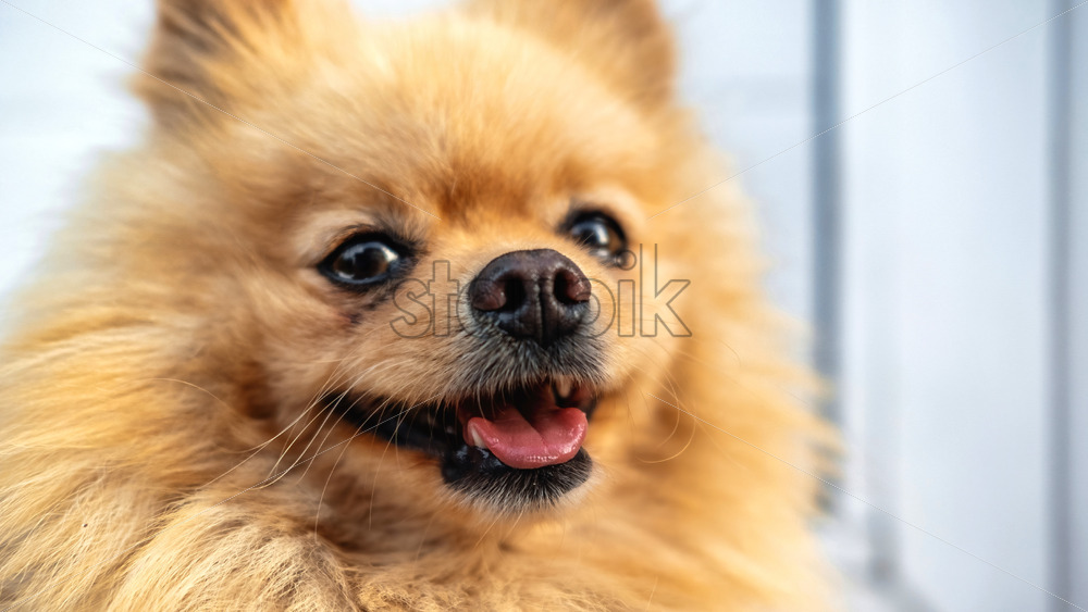 Portrait of Pomeranian with yellow fur, brown eyes, close view