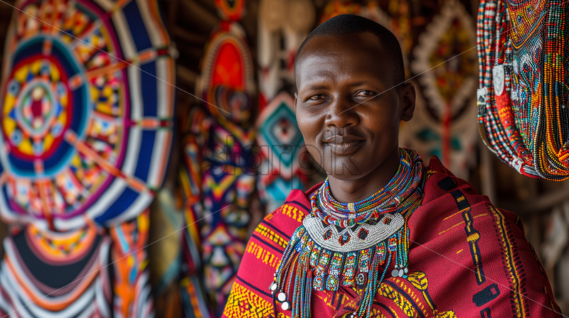 Maasai beadworker surrounded by colorful beadwork and traditional garments in a market or workshop.