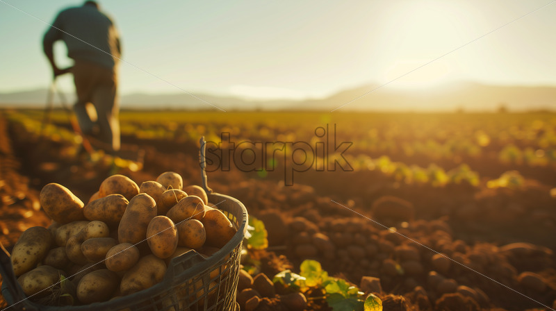 A diligent potato farmer in the expansive potato fields during a bright afternoon, with the focus on the basket filled with freshly dug potatoes.
