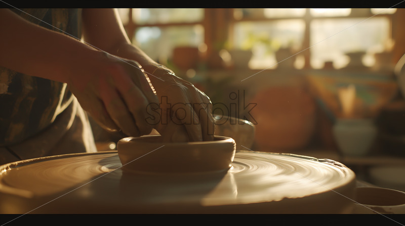 A pottery enthusiast, hands covered in clay, shapes and molds a piece of pottery on a spinning wheel in a sunlit studio. Their face radiates joy and creativity as they immerse themselves in the tactile art form.