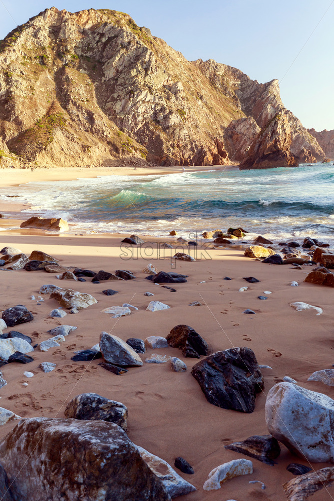 Beach on Aegean sea coast with rocks leading to the water, land in the distance in Nikiti, Greece. Slow motion, vertical shooting Royalty Free Stock Video Footage