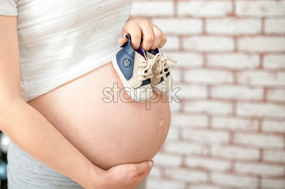 Close up of a pregnant woman holding white baby socks on her belly. Vertical Royalty Free Stock Video Footage