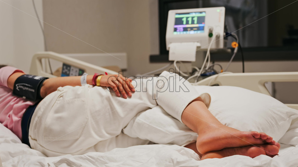 Close-up of a fetal monitor in a doctor’s office, displaying fetal heart rate and uterine contraction data during a prenatal check-up with a blurred view of a pregnant woman lying in a hospital bed Royalty Free Stock Video Footage