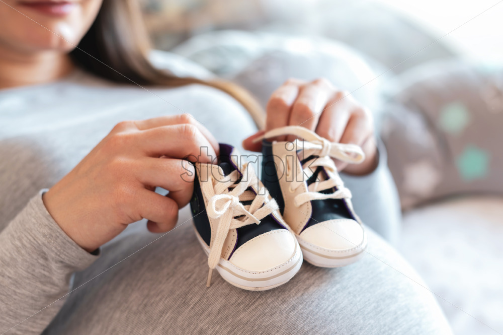 Pregnant woman lying on the bed and holding small shoes on her belly