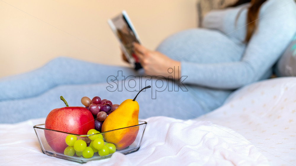 Pregnant woman lying on the bed and reading, dish with fruits on the foreground