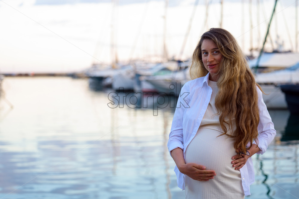 Pregnant woman posing at the port of Golfe Juan, France, vertical