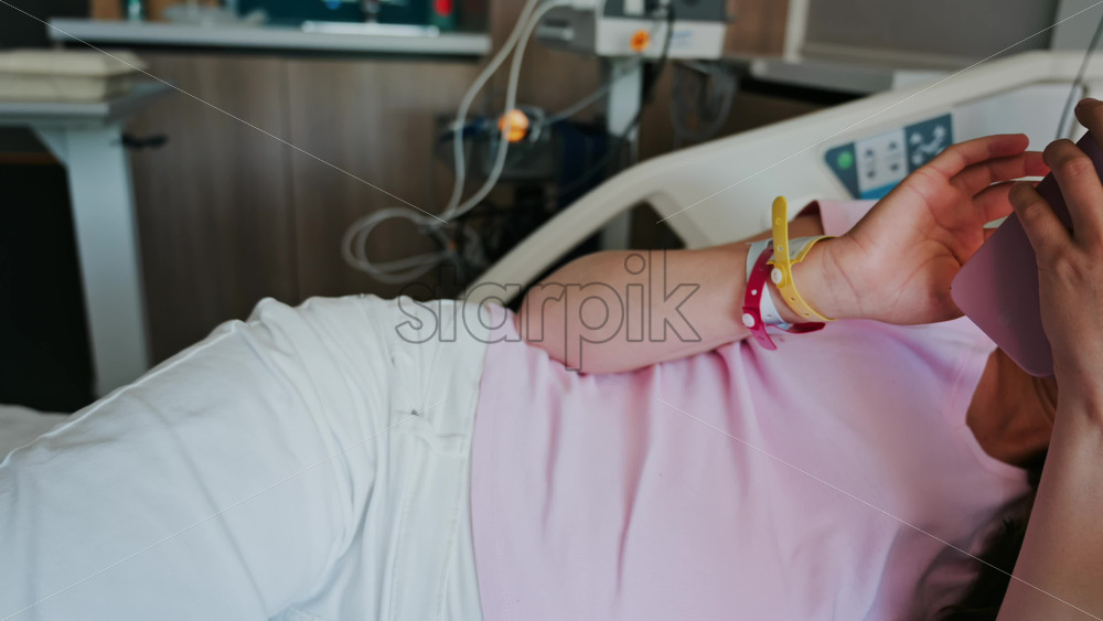 Pregnant woman scrolling on her phone while lying in a hospital bed at the doctor’s office Royalty Free Stock Video Footage