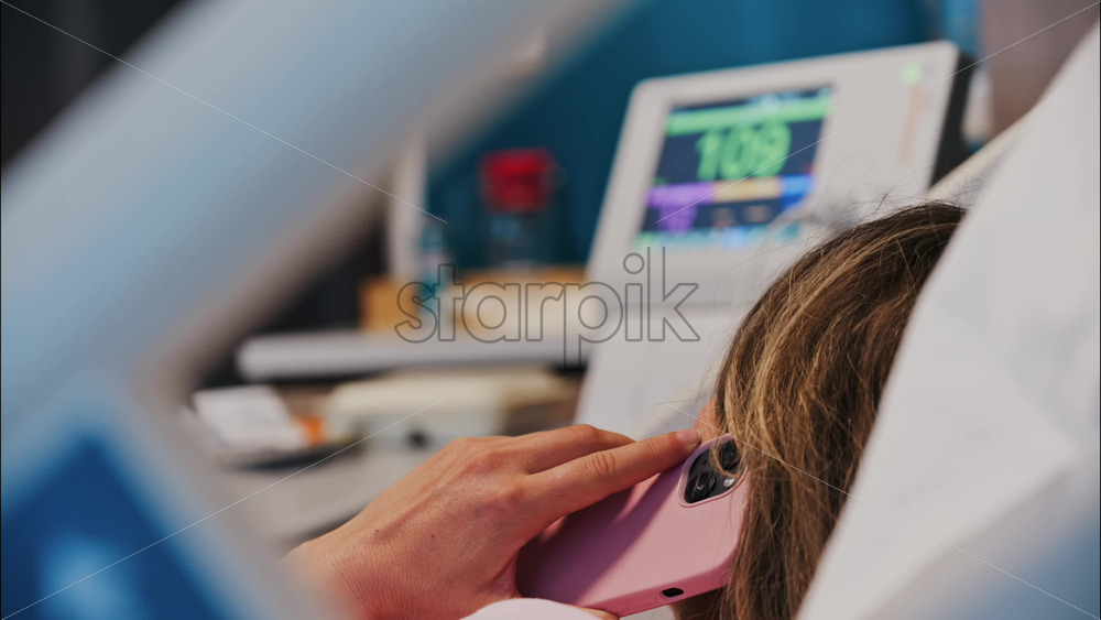Home » Shop » 1 Video » Video – Pregnant woman talking on her phone while doing a prenatal check-up at the doctor’s office