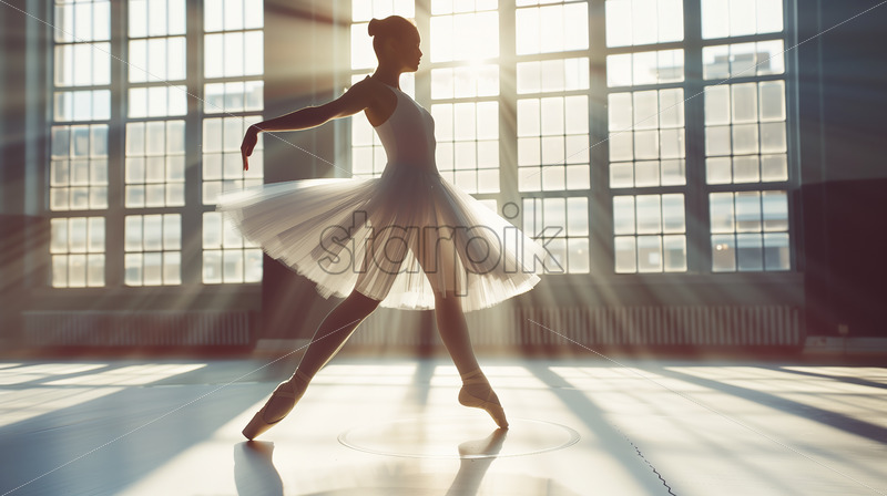 A prima ballerina practices in a sunlit studio, gliding across the dance floor with grace and elegance. Their face is serene and focused as they perfect each delicate movement and expression.