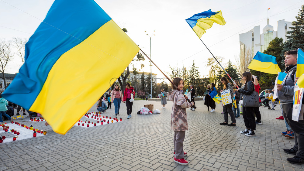 CHISINAU, MOLDOVA – APRIL, 2022: Protests against the Russian invasion of Ukraine in the center of the city. Kid holding Ukrainian flag, people with posters