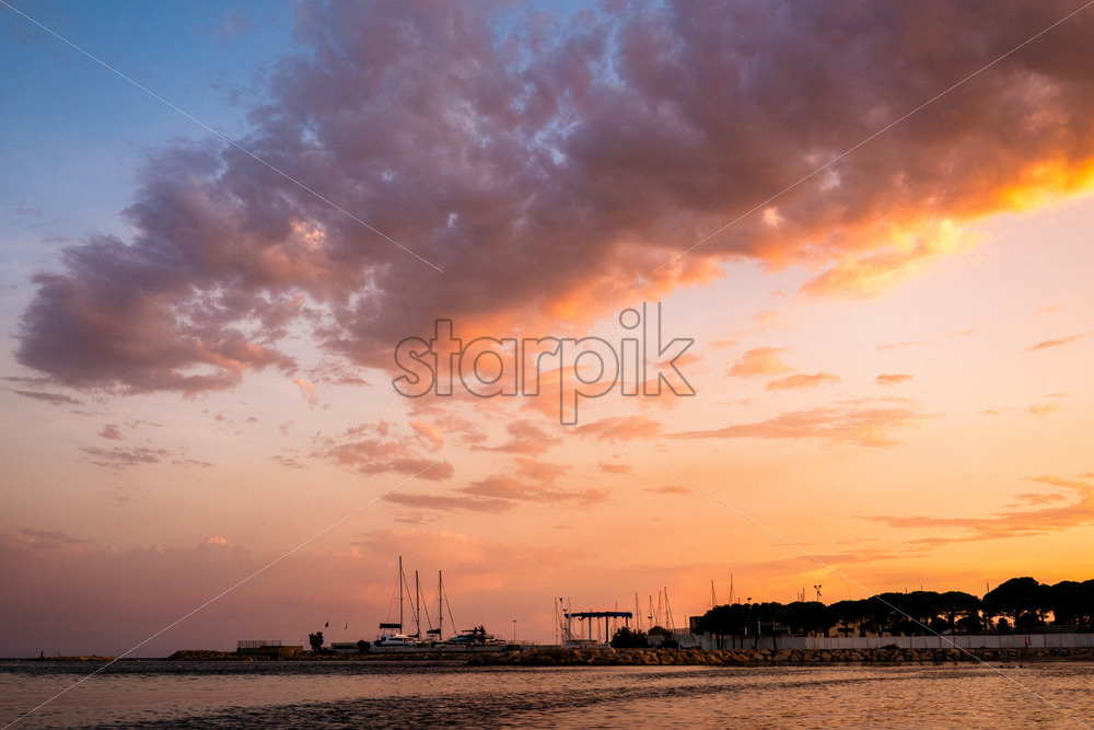 Purple blue pink sky at the beach of Golfe Juan Vallauris, France at sunset
