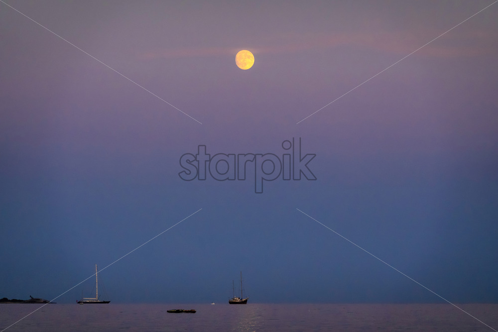 Purple pink blue sky in the evening with full yellow moon at the sea of Golfe Juan with boats, France