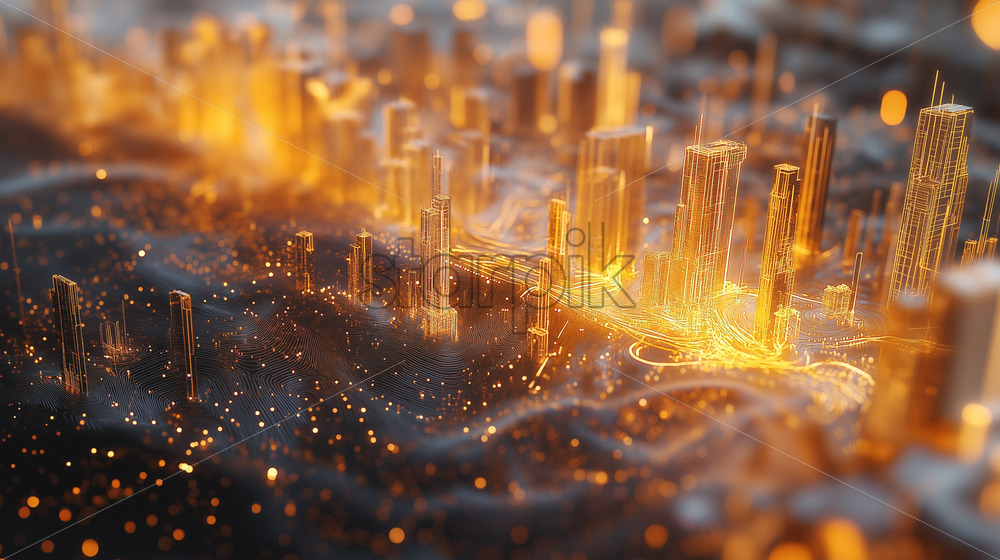 quantum computer powering an AI-driven cityscape, with energy pulses connecting buildings
