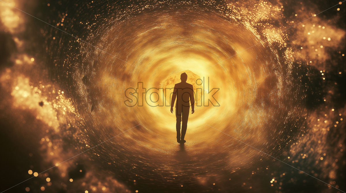 A person wearing a quantum suit, racing through a glowing tunnel of light