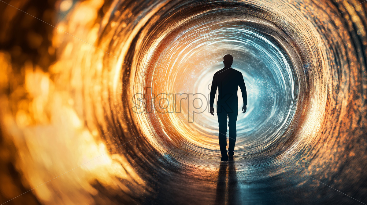 A person wearing a quantum suit, racing through a glowing tunnel of light