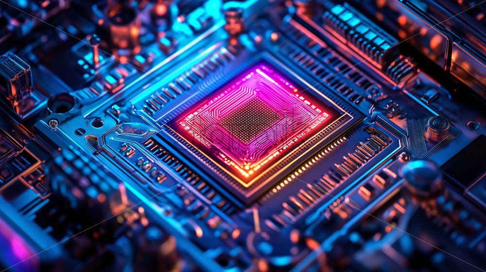 Home » Shop » AI Illustration » quantum processor chip inside a futuristic device, with neon circuits