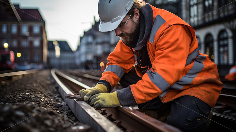 A focused construction worker in uniform diligently repairs equipment on the dirt ground of a construction site, with a blurred background of ongoing activities.