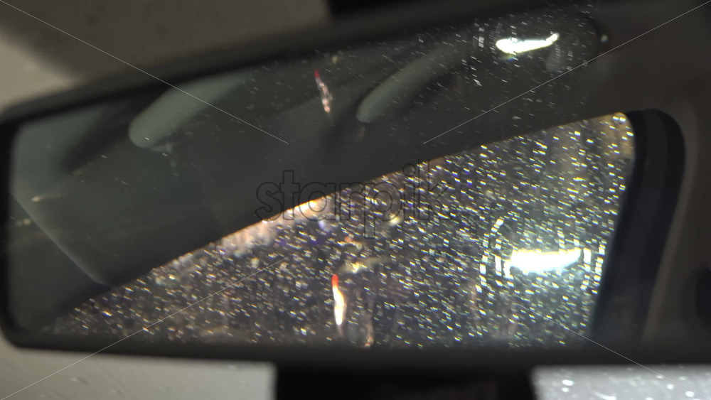 Rain dripping down the window of a moving car in the evening reflected in the rearview mirror Royalty Free Stock Video Footage
