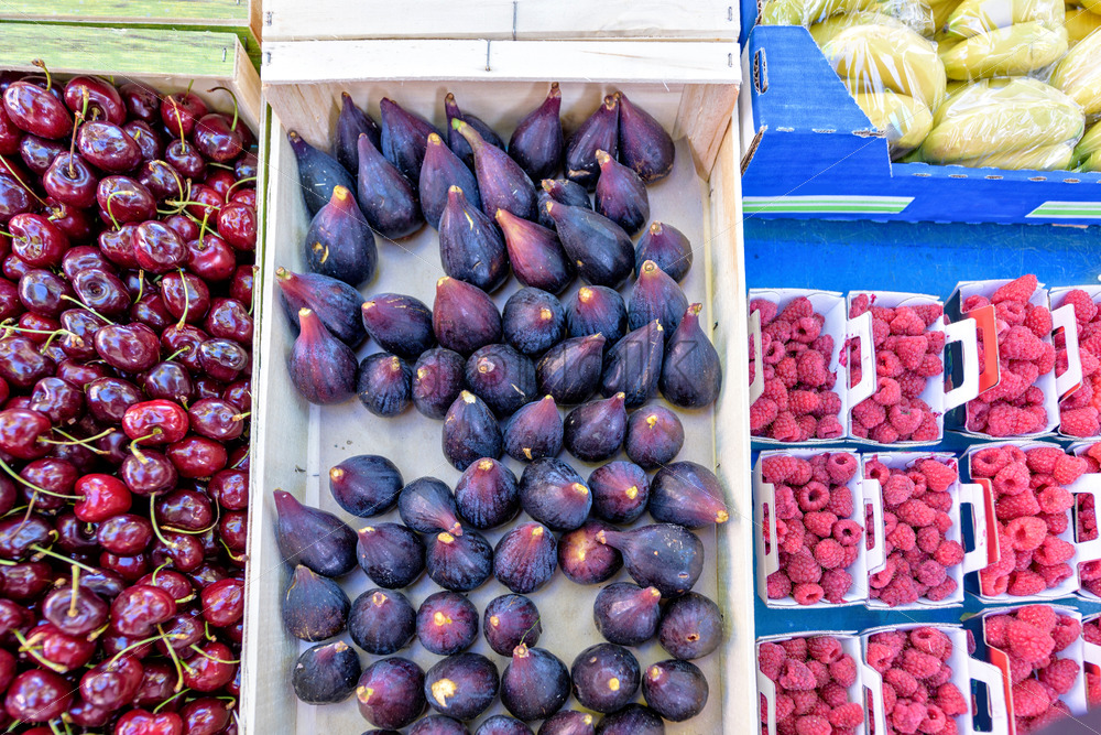 Red cherries, peaches, figs, bananas and raspberries in boxes for sale in local marketplace