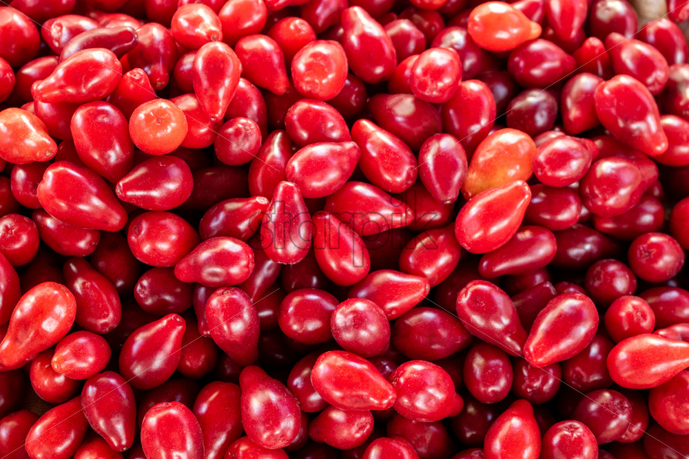 Red cornelian cherry fruits texture. Close up shot. Vibrant color