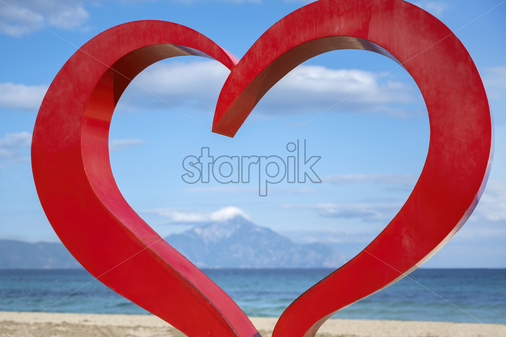 Red heart sign on the Aegean sea coast with water and mountain on the background, in Sarti, Greece
