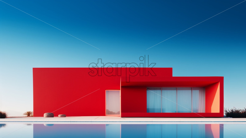An inviting photograph of an aesthetic two-story modern house with glass panes, a flat roof, warm lighting, wooden partition on the basement, and a rounded swimming pool in the front, surrounded by a garden, with trees in the background against … Read More