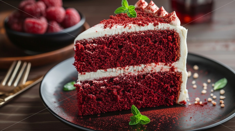 Delicate red velvet cake slices topped with cream cheese frosting and edible rose petals against on white isolate background