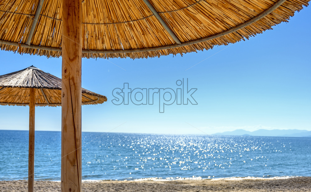 Aerial drone view of the Aegean sea coast in Nikiti, Greece. Beach with terraces, umbrellas and sunbeds on embankment street, multiple buildings Royalty Free Stock Video Footage Royalty Free Stock Video Footage