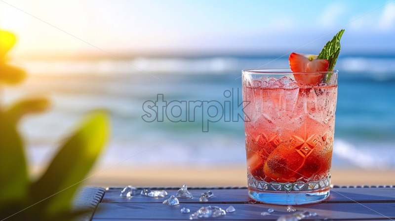 Red cocktail with orange slice on a table by the blue green sea video Royalty Free Stock Video Footage