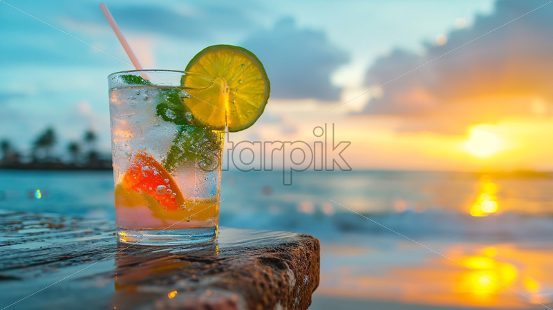 Red cocktail with orange slice on a table by the blue green sea video Royalty Free Stock Video Footage