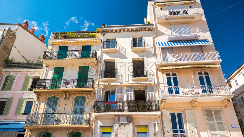 CANNES, FRANCE – AUGUST 31, 2021: Street scape of the town. Traditional buildings, people, sunny day