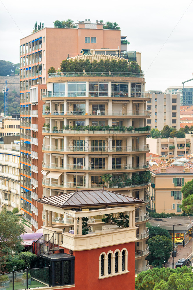 Vertical view of multi-storey residential buildings with greenery in Monaco