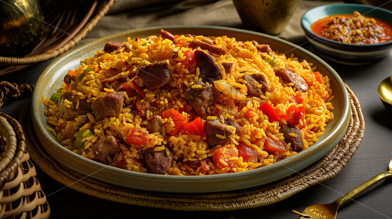 Djiboutian Skoudehkaris, a fragrant rice dish cooked with lamb or goat meat, vegetables, and aromatic spices.