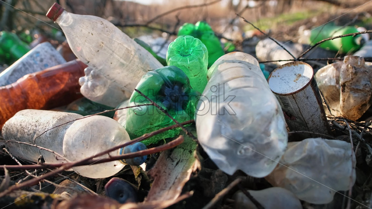 Boy and girl holding poster in defense of ecology at plastic garbage collection in a polluted clearing, recycling signs on the T-shirts. Slow motion Royalty Free Stock Video Footage