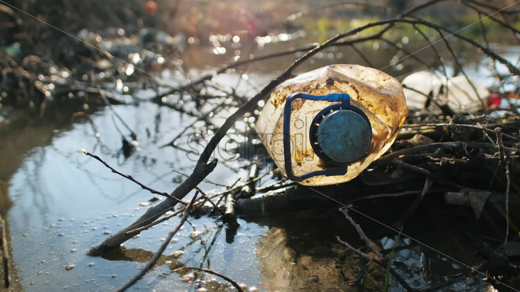 Boy and girl collecting plastic garbage in a container in a polluted clearing, recycling signs on the T-shirts. Slow motion Royalty Free Stock Video Footage