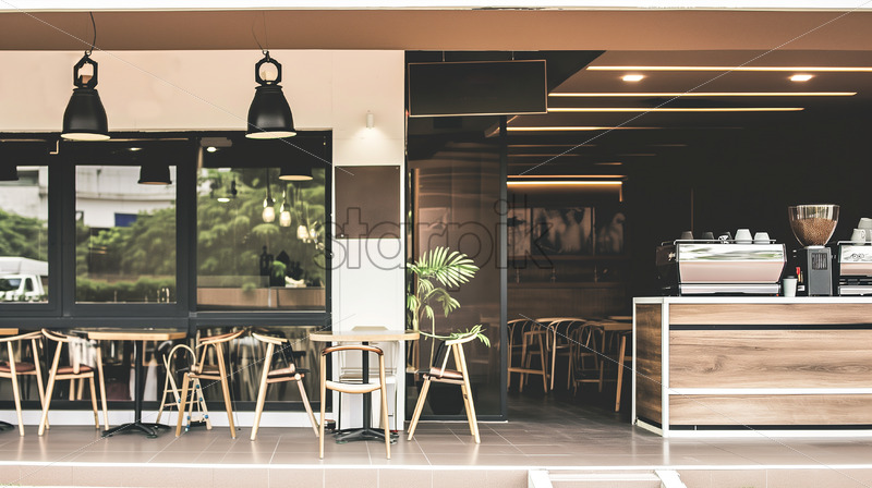 A delightful photo capturing the charm of a roadside coffee shop during the day, taken from outside, featuring wooden chairs and tables, exuding a retro ambiance through stylish photography.
