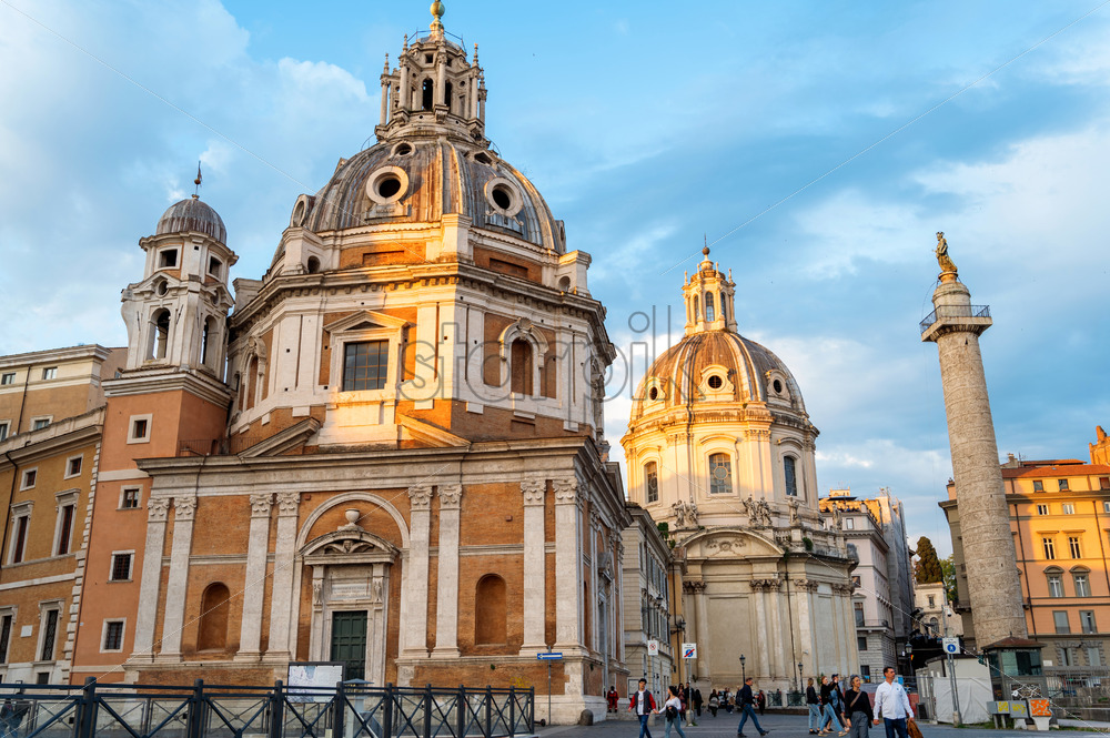 ROME, ITALY – JUNE, 2022: Street scape of the ancient centre of the city at sunset. Santa Maria di Loreto and Trajan Column, walking people