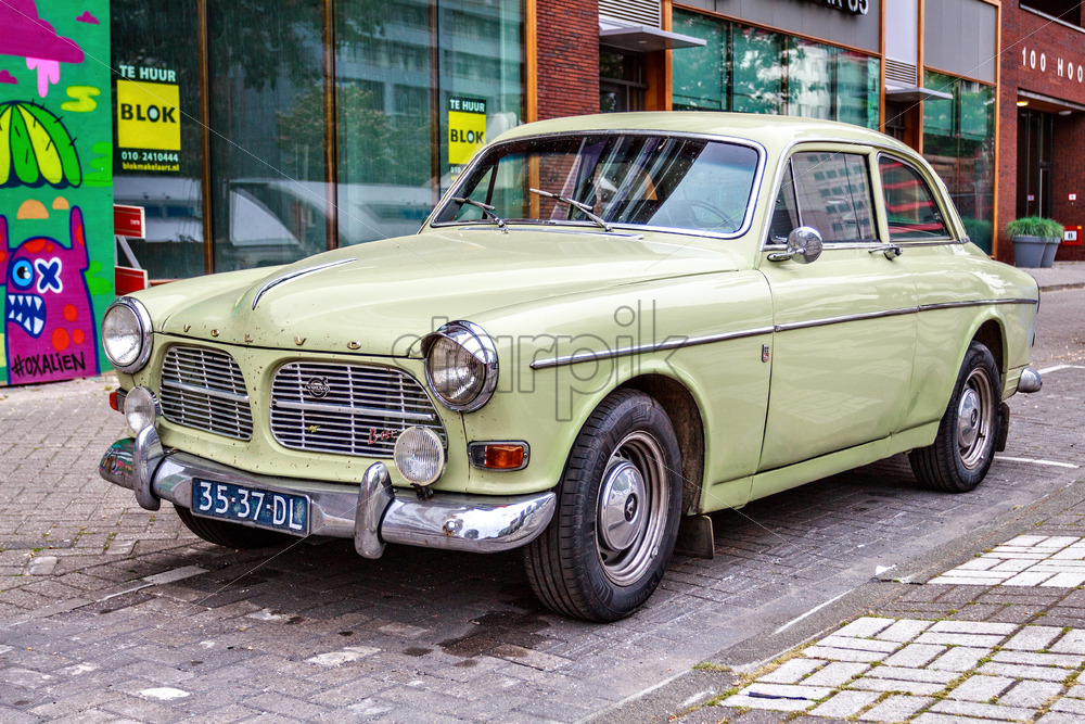 Home » Shop » photo » ROTTERDAM, NETHERLANDS – MAY 12, 2018: Old retro Volvo car parked on street pavage. Shops on background.