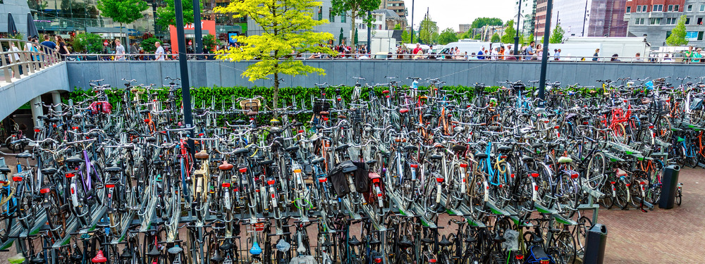 ROTTERDAM, NETHERLANDS – MAY 12, 2018: Seamless panoramic crowded bicycle park in the city. People walking on background Royalty Free Stock photo