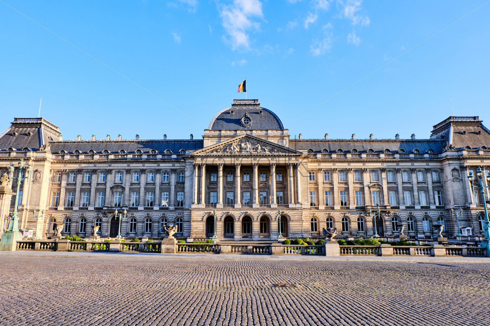 BRUSSELS, BELGIUM – MAY 9, 2018: City buildings facade at Grand Place in a sunny day. Bright clear sky on background. Negative copy space, place for text. Brussels, Belgium Royalty Free Stock photo
