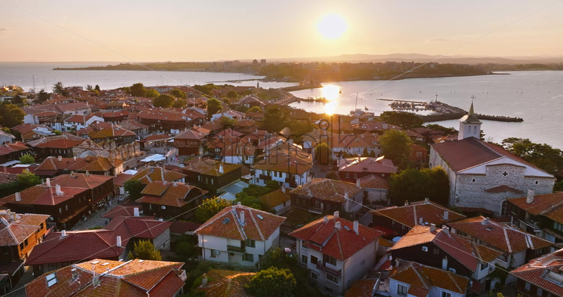 Royalty free stock footage Aerial drone view of the old town Nessebar, Bulgaria at sunset Royalty Free Stock Video Footage