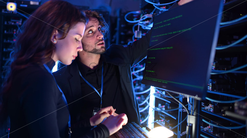 Royalty free stock video A man and a woman programming in a server room Royalty Free Stock Video Footage