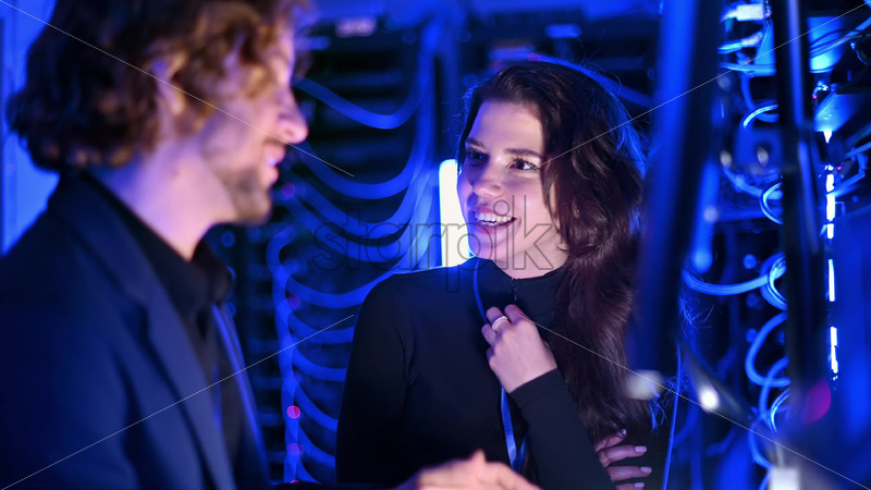 Royalty free stock video A man and a woman programming in a server room Royalty Free Stock Video Footage