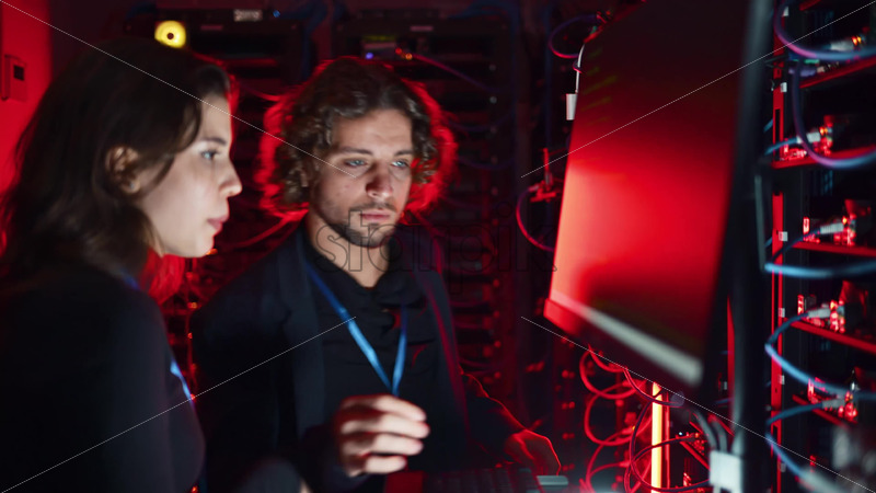 Home » Shop » 1 Video » people » Video – Royalty free stock video A man and a woman trying to fix an error in a server room with flashing red lights